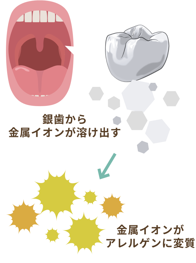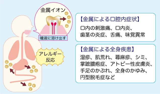 それが「全身性金属皮膚炎」と呼ばれるもので、金属が直接皮膚に触れることで生じるのではなく、口腔内の金属が唾液でイオン化し、体内に入ることで起こる接触性皮膚炎です。