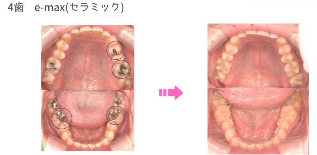 右下第一大臼歯、左上第一小臼歯、左上第一大臼歯、左下第一大臼歯のメタルインレーをe.maxインレーに置き換えた治療を行いました。全て神経が生きている歯だったので、浸潤麻酔を行い、金属除去後、歯型を取り、e.maxインレーを作成口腔内にセット後、咬合調整を行いました。