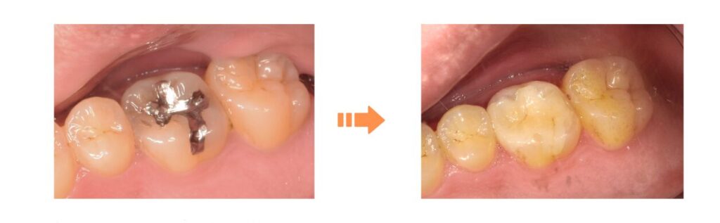 口の中の金属性の詰め物を白いもの(セラミック)に置き換えた治療です。