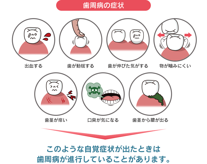 歯周病とは、細菌の感染によって引き起こされる炎症性疾患で、歯の周りの歯ぐき(歯肉)や、歯を支える骨などが溶けてしまう病気です。